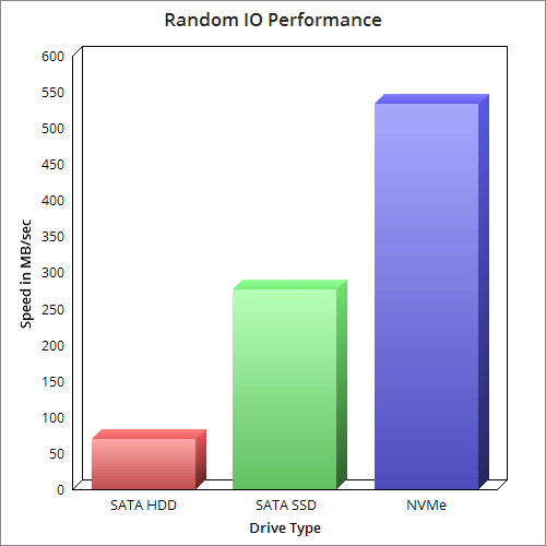 You can see that SSD offers a significant speed benefit over HDD in terms of raw data transfer – 180MB/sec higher.  But look at NVMe.  More than 7x faster than the SATA HDD and an astonishing 4x faster than SATA SSD.